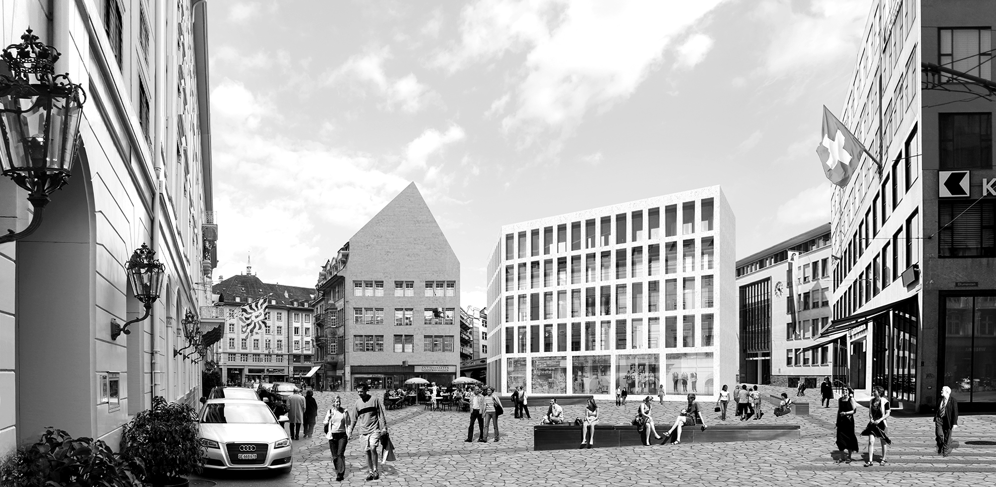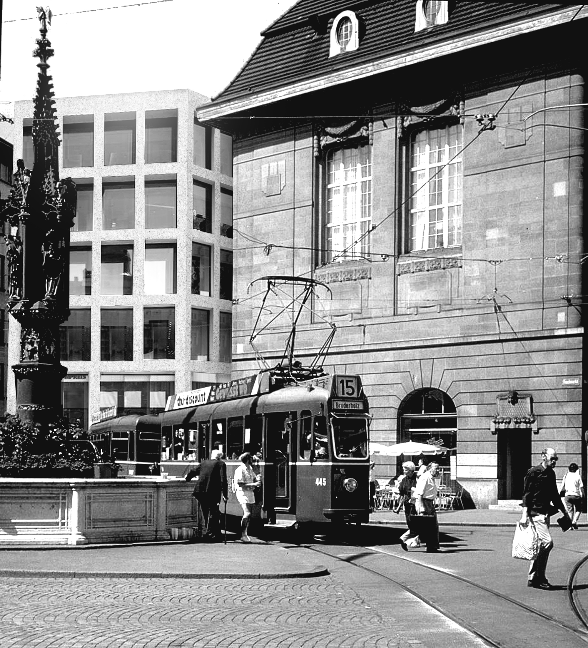 Our research into Basel’s urban core began with historical depictions of its public squares. Drawings show a city that was activated by pedestrians and plazas that were the centers of public life. However, photographs taken in their current condition tell a much different story of these plazas. Fischmarkt has become the site of a major tram loop; Schifflände, once a gateway for the city across the Mittlere Rheinbrücke , is now a void; and Blumenplatz has completely ceased to exist. All the primary streets have become overly widened to accommodate the massive amounts of transit lines that flow through the area. Spiegelstrasse in particular has become one of the widest streets in Basel with two lanes of car traffic, two tram lines, tram parking and large modernist buildings on both sides. The entire area, once the heart of the city, has become a place for moving people through, instead of a place for people to be.
